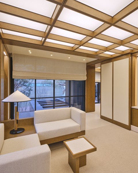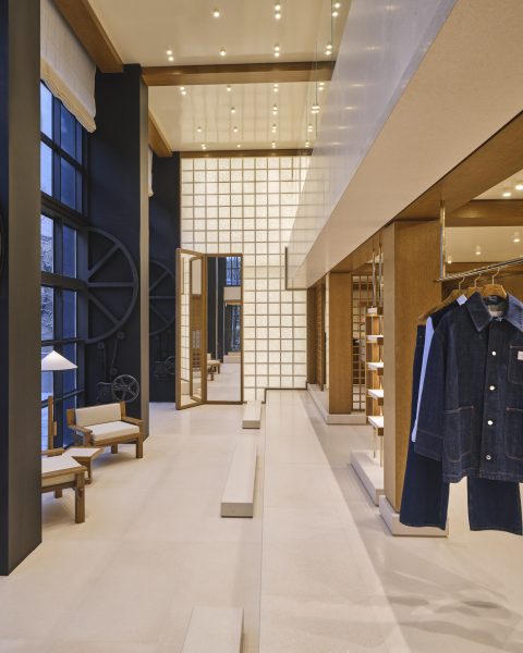 The store spans over 425 square meters and introduces a Parisian wardrobe starting with the Spring-Summer 26 collection. Guests are guided from the street through an underground passage, emerging into the Ami Garden before ascending to the main entrance. The design concept honors the defining features of traditional Hanoks, creating a cozy atmosphere through a refined interplay of materials: dark oak, granite, and Maljat stone, accented by Ami Paris’ signature elements of beige limewash, gold, champagne gold and mirror finishes.