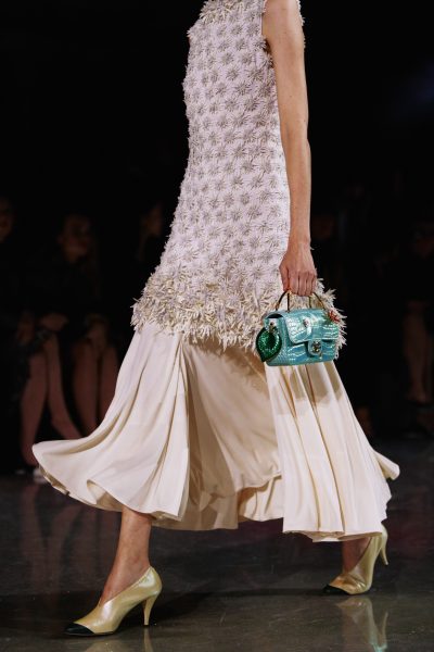 The dialogue between the real and the artificial that runs throughout the collection culminates in its accessories. Like an iridescent Impressionist painting, the opalescent set is reflected in colour-saturated enamel and resin jewellery, as well as in artificially tinted genuine mother-of-pearl pieces. Second-skin, cap-toed boots emphasise a sense of the unreal in pastel, supple leathers. While a plethora of bags span the practical to the playful. From the now familiar, essential suede flap bag, fast becoming a classic in its beige incarnation, with its ‘divan matelassé’ taken directly from Gabrielle Chanel’s apartment couch. To the latest ‘kinetic’ lock bag, and the extravagant pomegranate minaudière, with its enamelled, poisoned, iridescence.