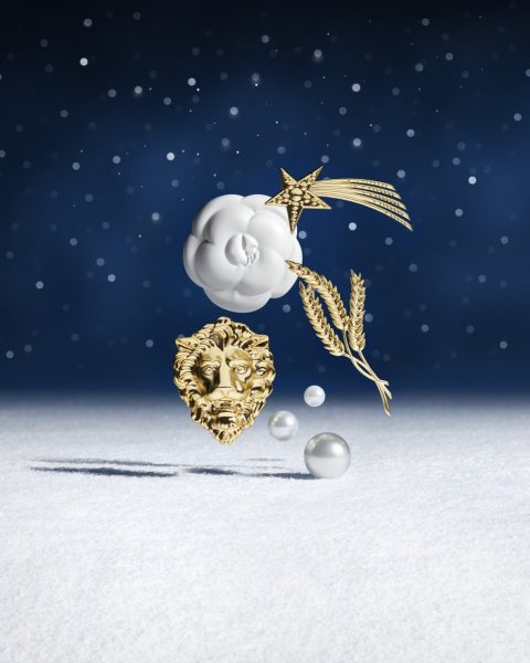 Mademoiselle’s five cherished talismans, iconic symbols of the CHANEL galaxy, orbit within the unique universe created by Cécile Paravina. The lion, the comet, the camellia, stalks of wheat, and pearls all appear in shimmering shades, infusing the scene with mysterious power. The complexion, eyes and lips are adorned with magnetic glints to celebrate the year’s end, right through to the break of dawn.