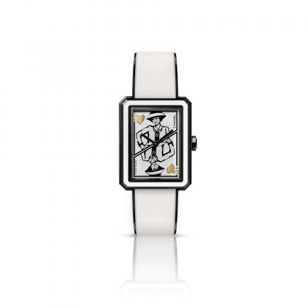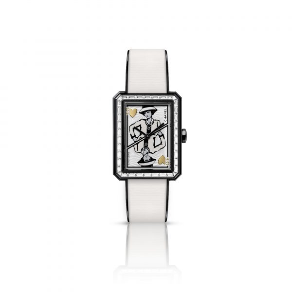 Applied as a transfer on the immaculate dial of the BOY·FRIEND, Gabrielle Chanel lends her unmistakable style to the Queen of Hearts. Her iconic suit in black-edged tweed, her boater and her layered pearl necklaces make up this black and white portrait. The sharp line of her silhouette is softened by the presence of two heart-shaped metallic applications.