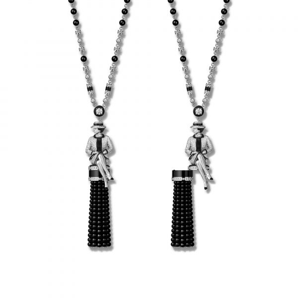 A sculptural creation, this necklace combining the two iconic colors of the House features Gabrielle Chanel in her iconic pose. This allure alone embodies the essence of Mademoiselle’s allure and spirit. The finesse of execution of this gold-sculpted silhouette, dressed in a diamond-set tweed suit, bears witness to the excellence of the artisans of the House.