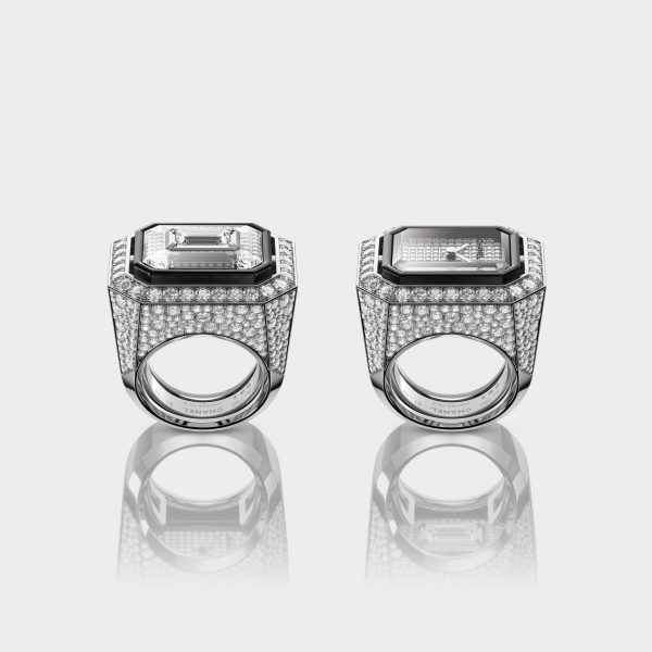 The strong lines of this secret ring feature two faces that are discovered by turning the diamond. Heads, a 0.90 carat baguette-cut diamond is embedded in the crystal sapphire glass revealing a gold plate set with diamonds. Tails, the octagonal dial of the Première watch appears, set with diamonds and highlighted with a blackened gold ribbon. The mounting is entirely set with brilliant-cut diamonds to offer a precious and stunning jewel, gloved in black and tailored for this ring.