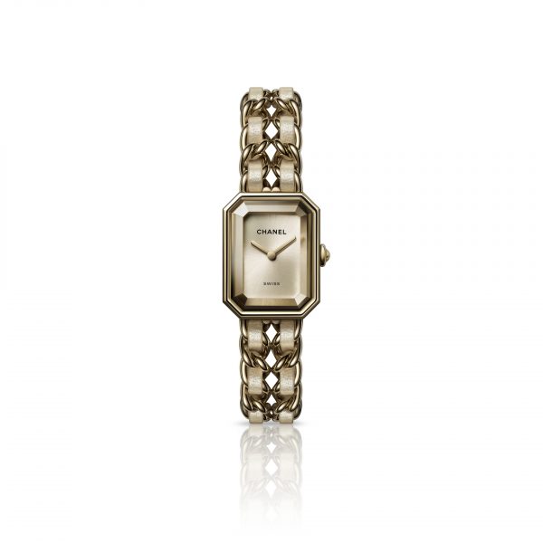 Created in 1987, the Première watch is the first CHANEL watchmaking creation. Inspired by the codes of the House, its distinctive lines evoke the stopper of the N°5 fragrance bottle while its supple bracelet interlaced with leather echoes the chain of the iconic quilted handbag. The sleek dial with no numerals underlines the essential: a spirit of freedom and audacity unique to CHANEL.