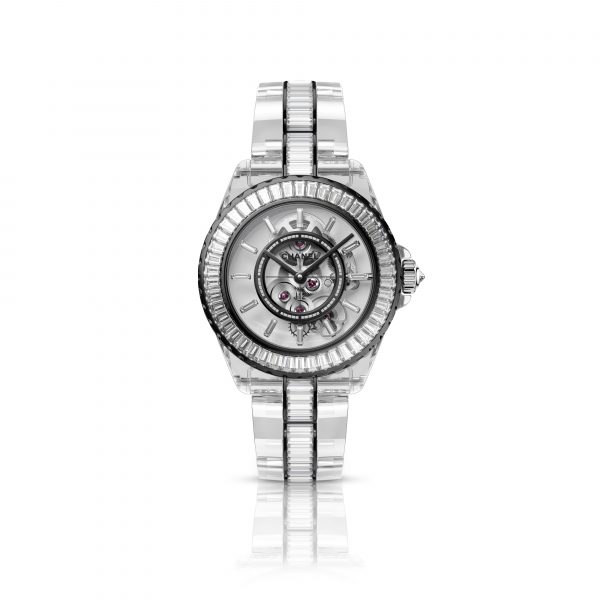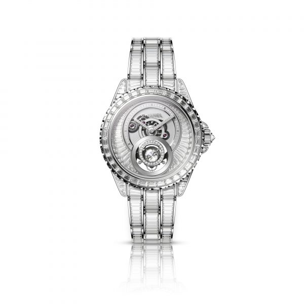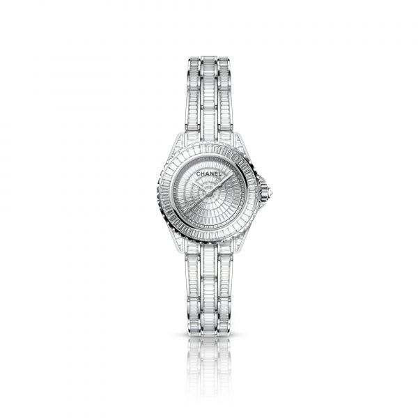 The J12 watch reveals a new format with a 28 MM dial and is entirely dressed in baguette-cut diamonds.