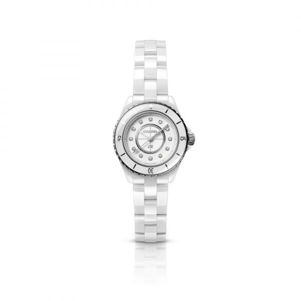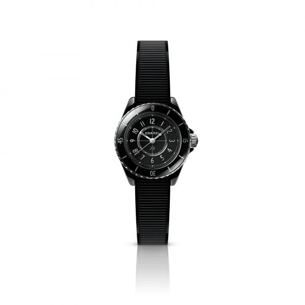 Six models make up the J12 28 MM collection. Alongside black or white ceramic watches, the Watchmaking Creation Studio unveils, for the first time, a J12 equipped with a textured black rubber strap with trimming.