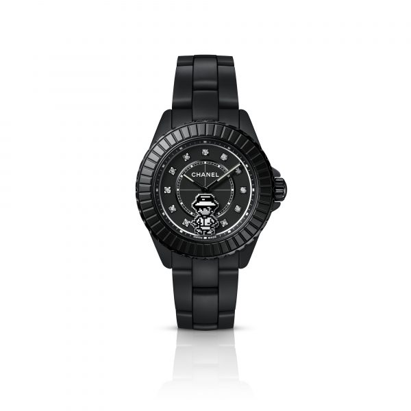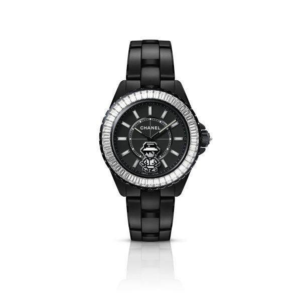 Mademoiselle becomes a pixelated character that trots around the dial of this J12 in matte black ceramic. To fit with the lightness and balance required for the seconds hand, Mademoiselle’s figure has been laser cut from a carbon plate. A technical feat that required 10 months of development by the artisans of the CHANEL Watch Manufacture. This Haute Horlogerie watch features a bezel and indexes set with baguette-cut diamonds, matched with a round brilliant diamond on the crown.