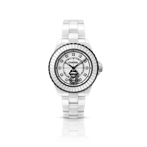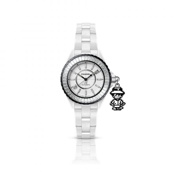 As if she just stepped out of a video game, a pixelized Mademoiselle transforms into a charm, suspended from the crown of a J12 in matte white ceramic. Combining polished steel with black and white lacquer, 10 months of development were necessary for the CHANEL Watch Manufacture to obtain smooth edges without distorting the pixel pattern. Demonstrating the precision and mastery of the artisans, the lacquer was applied on pixels measuring 0.5 mm.