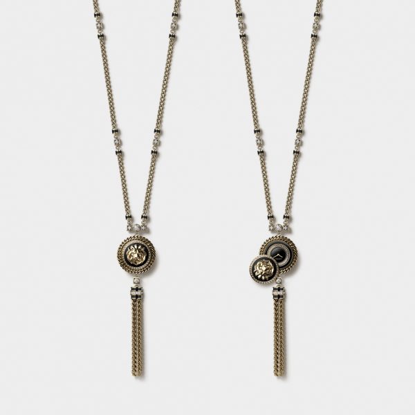 Time takes on a different allure with this long necklace that accompanies the movement of the wearer. The yellow gold chain is punctuated with onyx tubes and brilliant-cut diamonds. It holds the lion motif button whose feline face, carved in yellow gold, is framed by a double ornament: a circle of diamonds and a yellow gold chain.