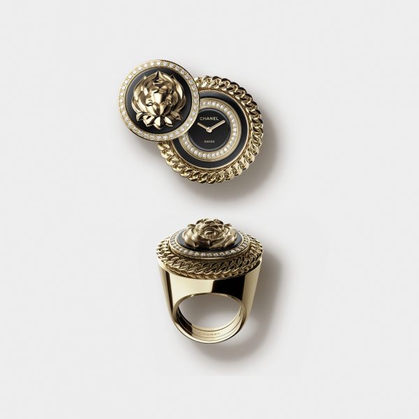 An expression of the personality and independence of women in the 1920s, the CHANEL Watchmaking Creation Studio revisits the cocktail ring by concealing a black lacquer dial set with diamonds under the lion button. Carved in yellow gold with utmost refinement, the lion’s head projects the powerful and noble character of the feline. Placed on an onyx base, it is surrounded by another circle of diamonds. Like a seal, the button is hemmed with a yellow gold chain and mounted on the body of this precious secret ring.