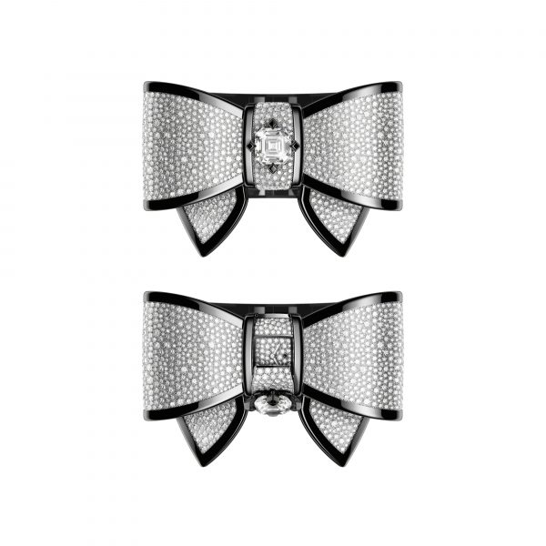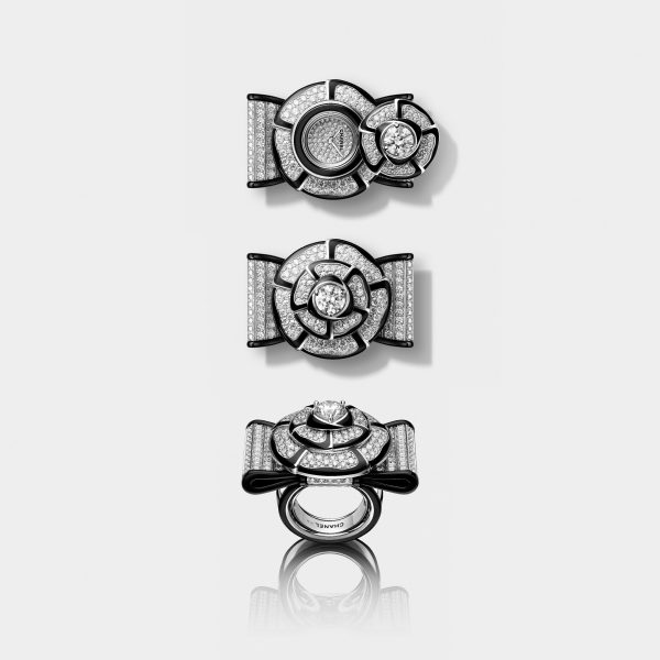 Black gold piping draws the ultra-precise lines of the NOEUD DE CAMÉLIA cuff and ring, both entirely set with diamonds. The snow setting of the flower evokes its authenticity, the line setting refers to the structure of the grosgrain fabric from which it is inspired. Bestowed with the grace of Couture and the sculptural curves of watchmaking, each camellia conceals a black lacquered dial.