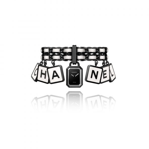With this PREMIÈRE, the graphic signature codes of the House – the line, black and white – are easy to read. Combining black coating, white lacquer and sapphire crystal, 6 charms swing to the rhythm of the wrist’s movement and spell out CHANEL with pure simplicity.
