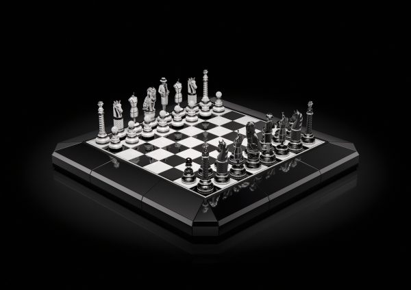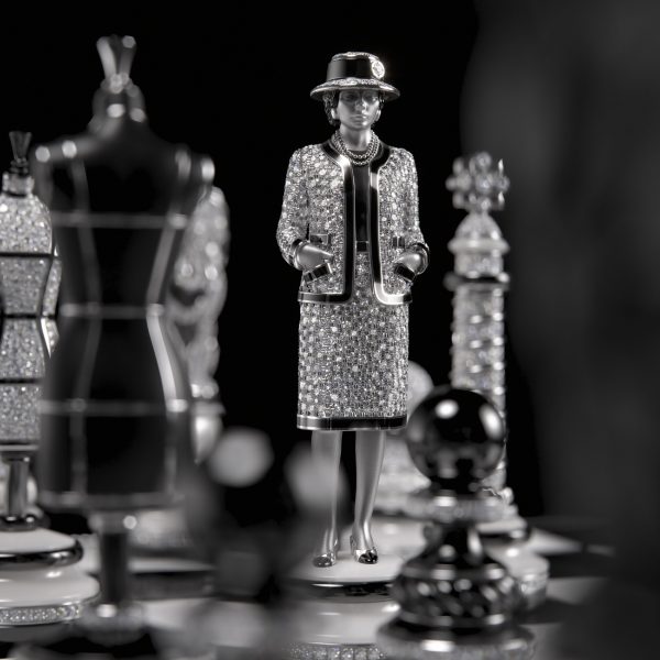 Queen of a game where any move is possible, Gabrielle Chanel becomes the central figure of an exceptional chess game. Black or white, each pawn of this unique chessboard has been crafted by combining, with extreme sophistication, gold, ceramic and diamonds. The Vendôme column, a mannequin bust, the lion… The 32 pawns refer to the universe of the House but only Mademoiselle as a white or black queen conceals the time under her iconic slingbacks.