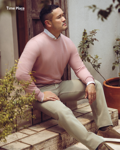OUTFIT – ZEGNA Light Pink Mélange Cashseta Crewneck, Cashco Shirt Light Pink, Light Taupe Roccia Pants, Dark Beige Suede Triple Stitch™ Sneakers