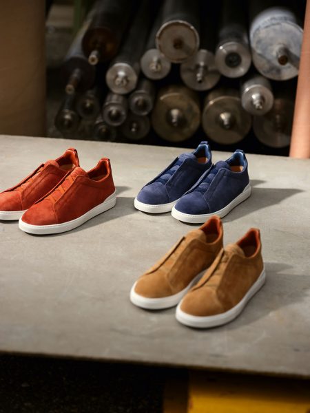 The enduring triple crossed elastic not only means the sneakers slip on and off easily but also speak to Zegna’s heritage, recalling the three hand-stitches on a suit lapel.