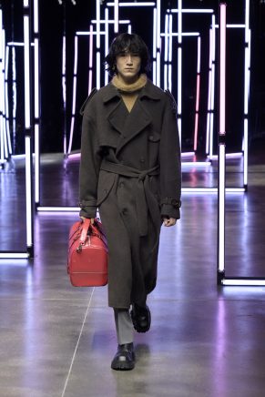 One by one, a broad spectrum of menswear classics is twisted with FENDI playfulness, emerging from darkness into full Technicolor. The result is an unabashed celebration of color and light, and a universal message of solidarity and connection in Surreal times. A jewel palette sees emerald, vermillion, saffron, orange, fuchsia, cobalt and periwinkle color-blocked against black, camel and charcoal, as linings, inlays and slashed seams flash with contrasting textures and shades.