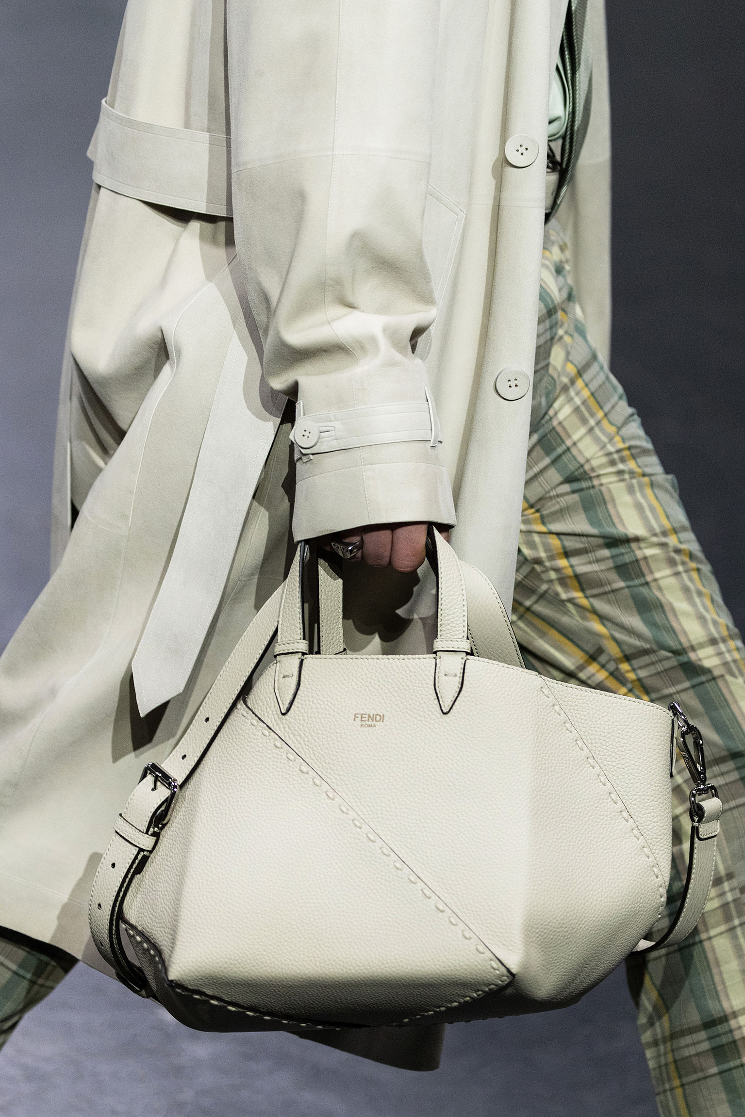 From head to toe, the collection revels in the virtuosity of the Selleria stitch, a technique passed to the Fendi family by Roman master saddlers in 1925. Scaled up and down, it is re-interpreted as a broken pinstripe suiting jacquard and threaded as a stripe or tonal FF logo through linen and plush textures, applied as a surface on Japanese boro denim, or reduced to a minimalist frame on crisp wool outerwear and leather goods. Subtle volumes create whispers of the past, as in an ample cloth bomber jacket, fluid trench coat, and 3-button blazers paired with slashed trousers cut loose through the leg. Contoured details twist the propriety of garments: poplin shirt sleeves slashed at the elbow may be worn long or short, polo plackets twist from throat to rib, and asymmetric silk knits unbutton down the shoulder creating an airy modularity. Over pleated shorts, long, patch-pocket overshirts with silk ties are layered beneath short summer jackets in tonal combinations of linen, leather, Madras check cotton and ultralight suede.