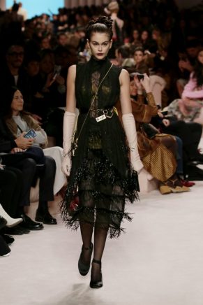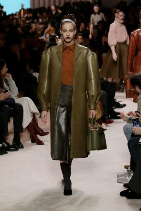 Emerging through offbeat contrasts and elegant monochromy, a heady mix of cashmere, fur, leather and lace become the pillars of this season’s FENDI wardrobe. Tailoring and outerwear is built around a nipped waist; flared officer’s coats, burnished perfectos and high-octane blazers are boned through the bodice with shoulders that plane to a flat point or drop into a Juliet sleeve. Voluptuous shapes unfurl into cozy loopback sweaters, a bonded leather accordion skirt and bibbed organdie blouses – countering the strict line of a nurse’s collar, men’s shirt stripes or corset detailing in quilted satin and felt. Revisiting animalia, a paisley of leopard spots appears in brushed wool tailoring and intarsia fur, whilst ornamentation arrives in a swathe of fringed beads or the neon shock of apricot Chantilly lace. Provocative yet restrained, a daring education from FENDI’s femme fatale is the order of the day.