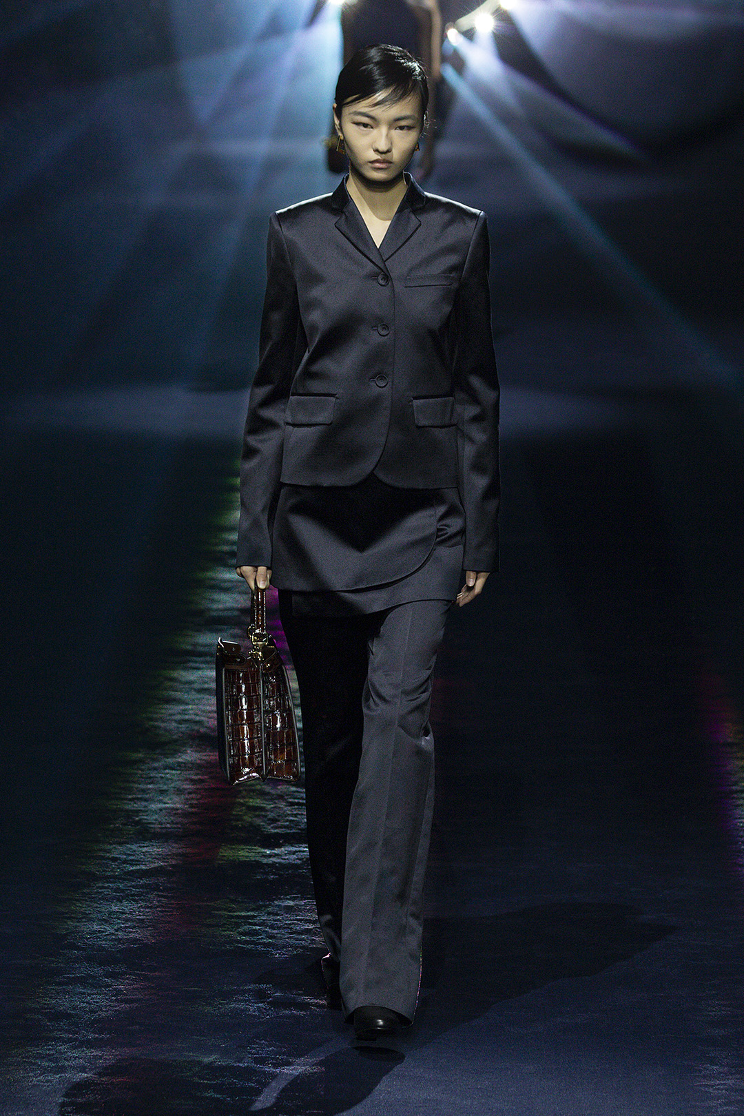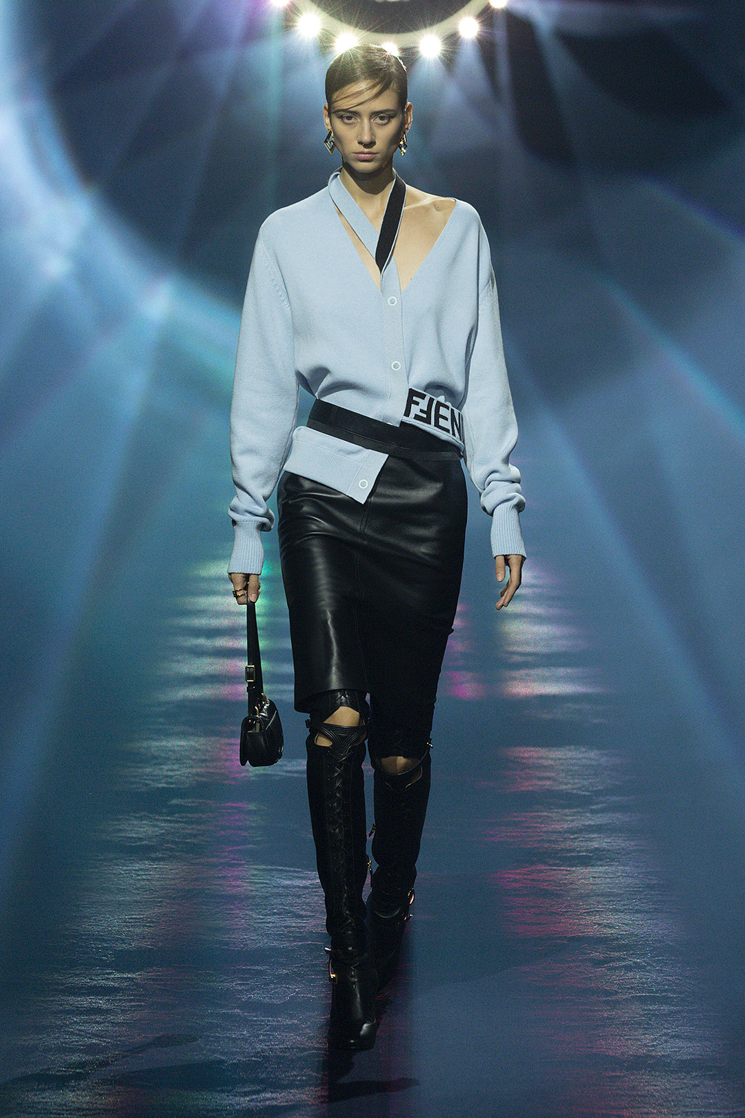 The Fendi Womenswear collection features masculine tailoring with utilitarian deconstruction. Asymmetricality also takes the spotlight in this illusionary show; the first look demonstrates Jones’ exploration of this. An asymmetrical V-neck buttoned sweater with no clear tailoring is paired with a structured leather skirt. The juxtaposition between classicism and unique self-expression exemplifies the Italian fashion house’s yearning to deconstruct boundaries, destroy binaries, and subvert expectations.