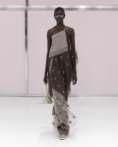 The new collection blends eveningwear with casual pieces, effortlessly exploring a neutral palette, while occasional pastel hues grace distinct pieces such as collared long-sleeve tops with cinch belts. On another note, a diaphanous silk dress beautifully captures the delicate interplay of colour, transitioning seamlessly from mint to muted grey. Its asymmetric silhouette, accented with subtle floral embellishments, infuses the design with a whimsical charm, while the single-shoulder strap lends a modern edge. With its flowing fabric and ethereal layering, this piece encapsulates FENDIs perfect balance of romance and contemporary sophistication.
