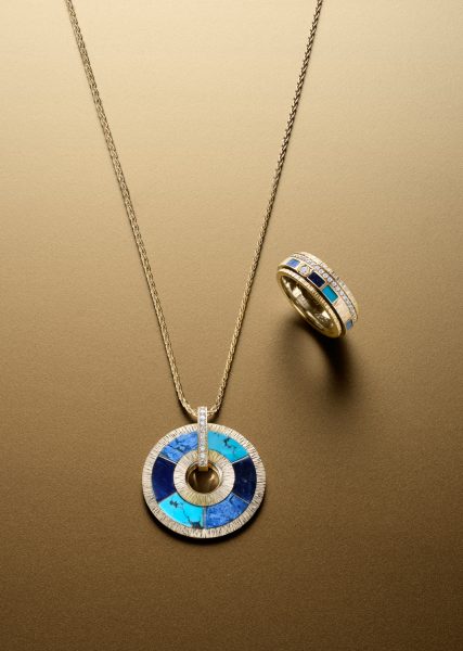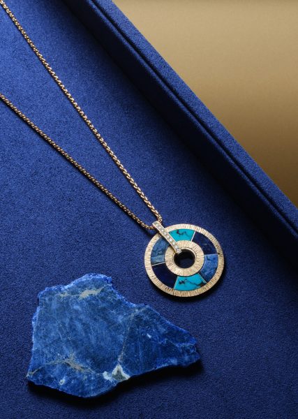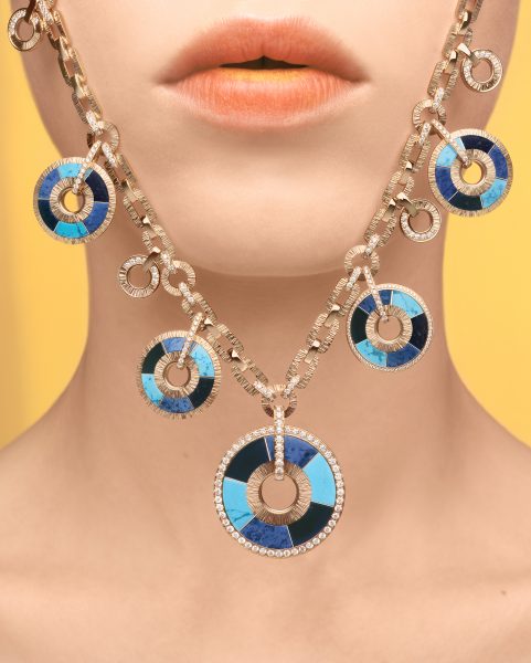 Possession Vibrant Palace awakens a new dimension. Enriched with pieces that are both poetic and eloquent, the collection introduces a stunning hard stone mosaic, combining the signature gold engraving of Decor Palace with captivating ornamental stones. Accented by precious details that blend the brilliance of rose gold and polished gadroons with half-moon-set diamonds and colourful stones, each piece plays with asymmetry, rooted in airy yet graphic shapes. Each stone is unique, stemming from the Maison’s age-old savoir-faire and making every piece of jewellery exceptional. In these living masterpieces, the texture of stones, the eclectic use of square and oval shapes, the depth of shades and the resonance of light intertwine, in the style of a painting composed of vivid, shifting contrasts. Meticulously cut, delicate turquoises, azure sodalites and captivating dumortierites blend harmoniously in a hypnotic mosaic, enshrining each piece as a precious talisman. With a subtle echo to the amulets that have enchanted human imagination since the dawn of time, Piaget revives this vision, transforming each piece of jewellery into a protective gem. The collection’s aesthetics intimately convey this symbolism, filling each sparkling jewel with a deeper meaning. The pieces’ circular shape, a universal symbol for prosperity and luck shared by many cultures, intrinsically lends them a protective dimension.