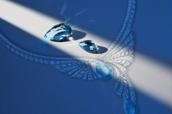 These creations play with volume to achieve a pure light extravaganza while their radiance reveal itself through different angles and multiple shapes. Designed for greater fluidity and utmost comfort, the articulated Exalting Dance Necklace is arranged around a pair of intense blue aquamarines and a twirling diamond volute offering a spectacular glow.