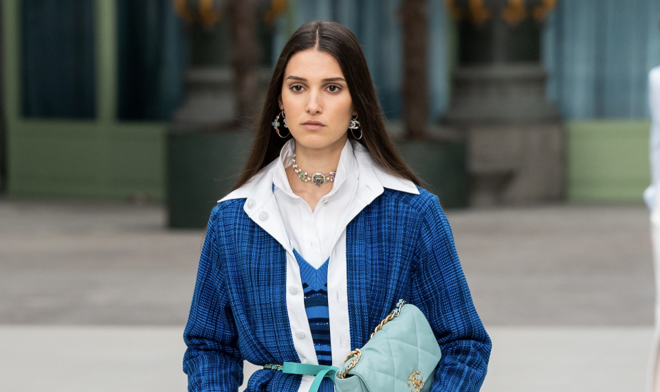 Pairing an oversized printed blue blazer with white pants or a blue skirt and jacket set, as seen from the CHANEL Resort 2020 runway. Wearing a sophisticated embroidered blue top with a tulle skirt for a weekend outing, as seen from the RED Valentino Spring 2020 collection. Or wearing a matching tailored blue skirt and blazer for office purpose, as seen from the FENDI resort 2020 collection.