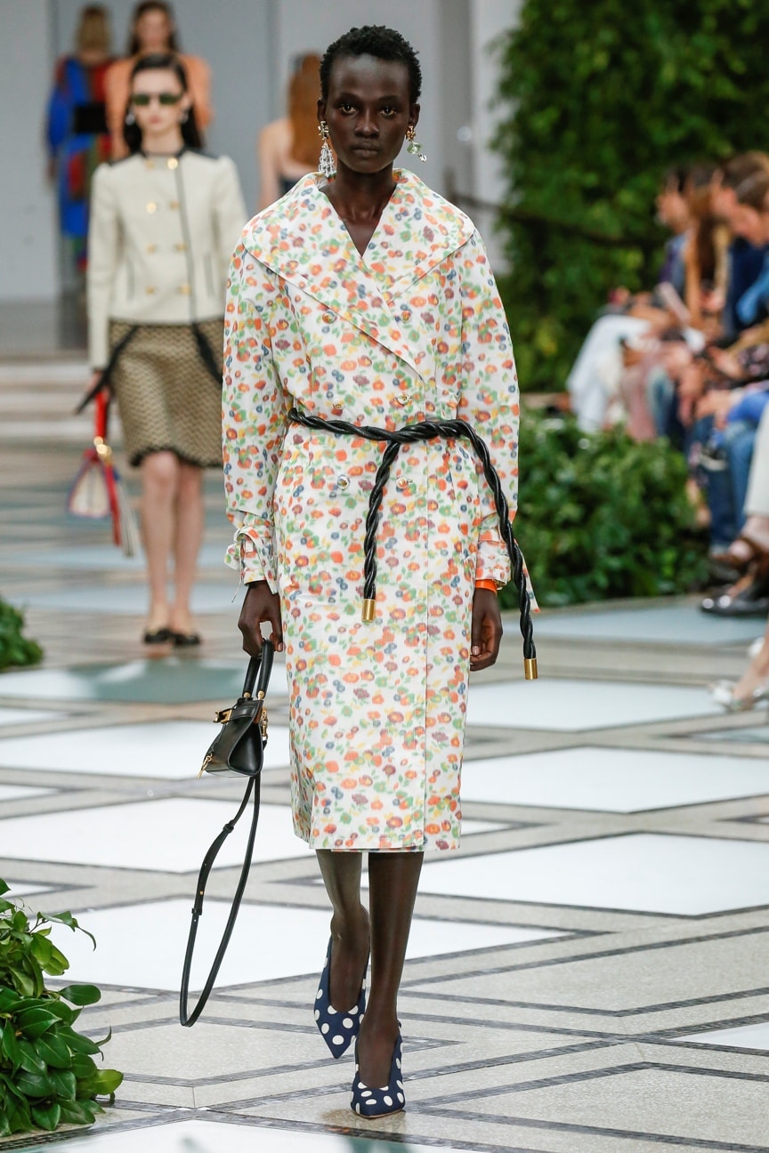 Silhouettes: Blouson shapes—soft balloon sleeving, cinched waists, oversized taffeta bows—nod to the easy exuberance of the Eighties. Billowy trousers – harem pants and wide- legged palazzos – convey a sense of considered nonchalance. Gentle volumes juxtapose tailored pieces such as button-downs, trench coats, and cardigans.