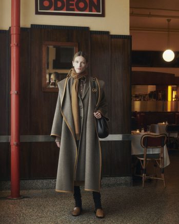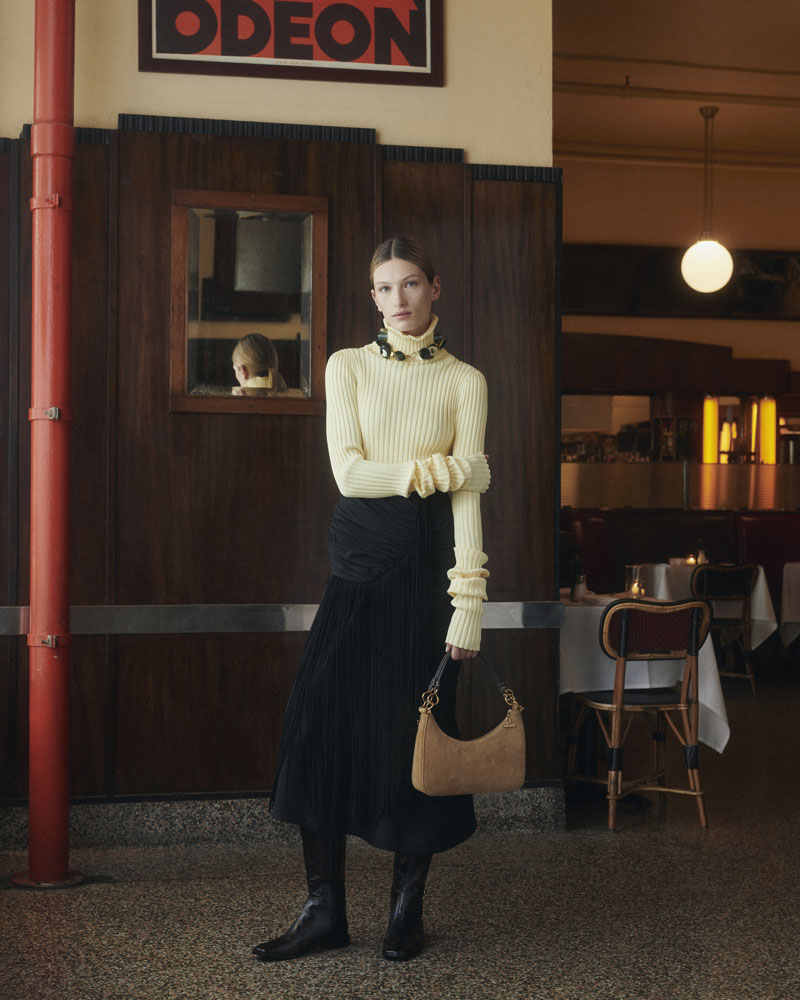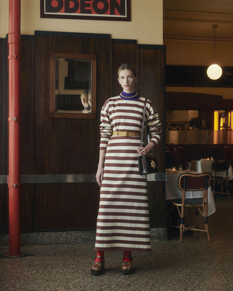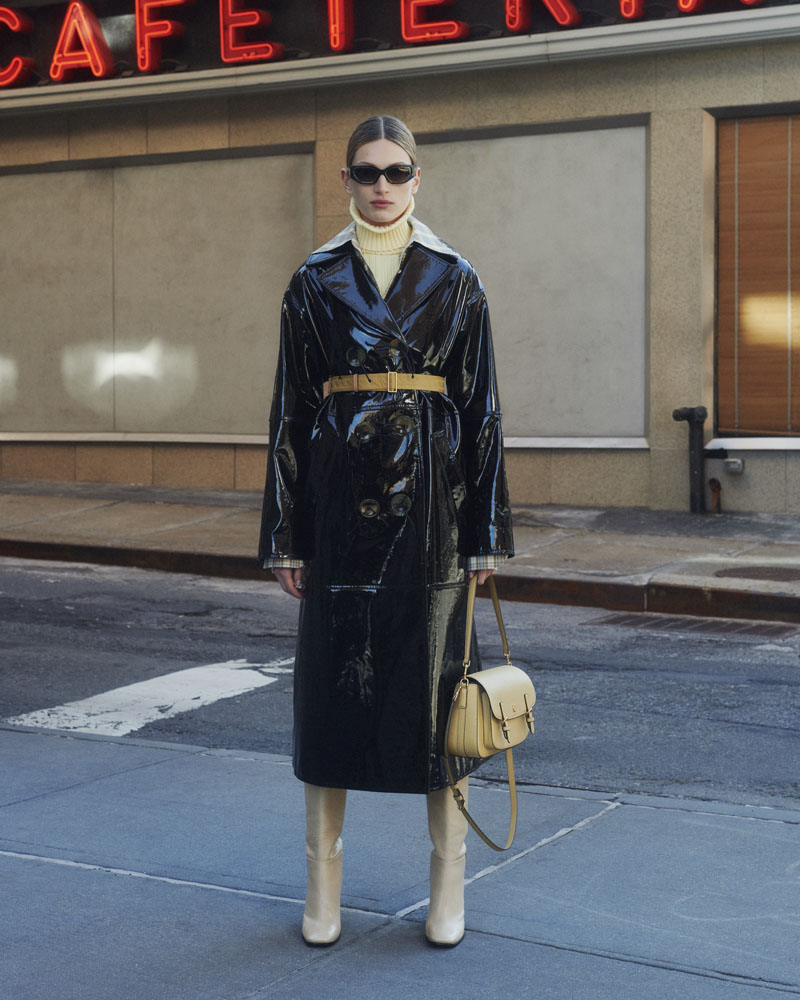 The collection reinterprets American luxury and sportswear, channeled through the attitude of classic New York. Timeless pieces that are grounded in the reality of how women want to dress. It starts with the idea of seasonless dressing and layers, the foundation of wardrobes women will reimagine in their own way. Crisp cotton shirts, knit turtlenecks and feminine shirtdresses; men’s suiting with softer proportions and poplin evening dresses, all of which can be styled differently for warmer weather. Accessories and jewelry add dimension to the layers: louche hobos and structured crescent bags, loafers, curved-heel boots and gold and multi-button chokers.” — Tory Burch