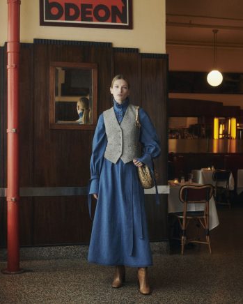 SILHOUETTES: Timeless and classic, focusing on the elegance of American luxury. The foundations of a seasonless wardrobe that is not defined by a specific time period and which women can mix and match. The juxtaposition of classic silhouettes mixed with unexpected fabrics: barn jackets bouclé-lined leather; structured skirt suits in raw Japanese denim, and a long poplin dress detailed with chiffon fringe. Tailored blazers and vests; deconstructed men’s suits, worn belted. Effortless tunics and dresses in linen, denim or cotton poplin. Pants show up with soft pleating or in a classic sailor silhouette done in moleskin. Everything is worn with layers of either turtlenecks, cotton shirts, vests or dickies, which have become a signature of the collection.