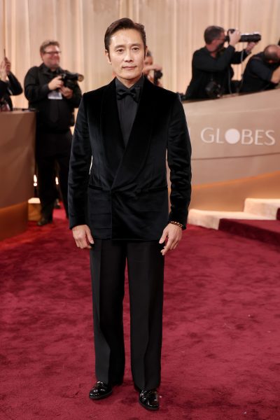 Golden Globe Award nominee Lee Byung-Hun, nominated for Best Actor in a Musical/Comedy (No Other Choice), wore a ZEGNA 2026 Red Carpet Collection velvet tuxedo jacket, silk tuxedo shirt, wool mohair trousers, and a silk bow-tie, all in black.