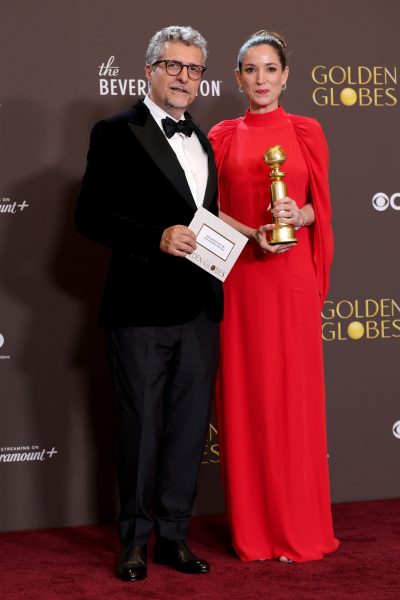 Golden Globe Award winning director Kleber Mendonça Filho, who received an award for Best Non-English Language Motion Picture (The Secret Agent ), wore a ZEGNA black velvet tuxedo jacket, white cotton tuxedo shirt, black wool mohair trousers, and a black silk bow-tie, with black leather lace-up shoes.