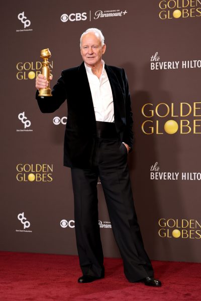 Golden Globe Award winner Stellan Skarsgård, who received an award for Best Supporting Actor in a Motion Picture (Sentimental Value ), wore a ZEGNA made-to-measure 2026 Red Carpet Collection black velvet tuxedo jacket, white mandarin collar cotton shirt, black wool silk trousers, and a black silk cummerbund, with black gala smooth leather loafers.